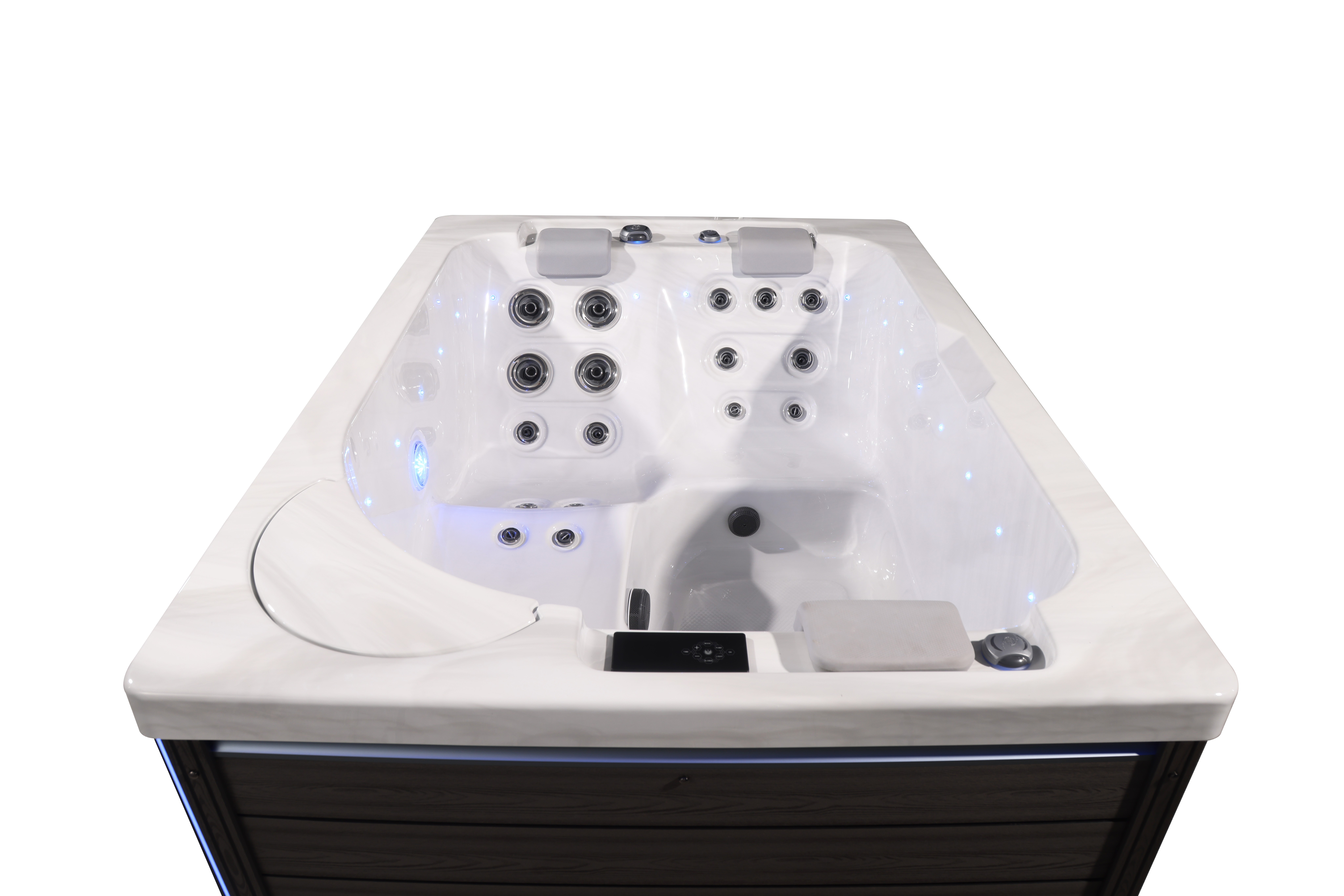 NordicSpa Magni с размером чаши 2,2 x 1,6 м идеально подходит для установки как в помещении, так и на улице. Компактная, но просторная чаша с тремя эргономичными подголовниками комфортно вмещает до трех человек, создавая уютную атмосферу для отдыха и общения.